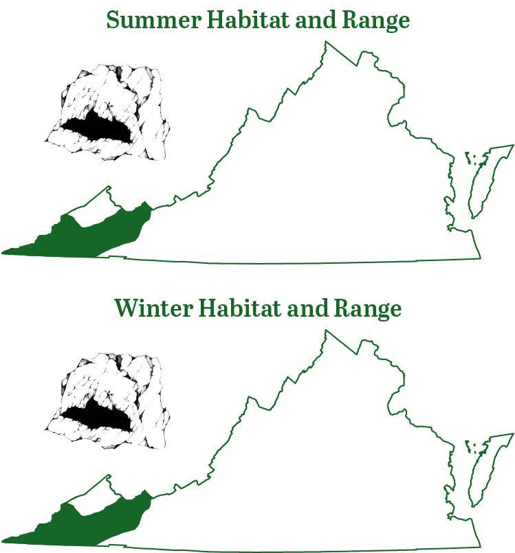 El murciélago gris y el murciélago orejudo de Virginia son los verdaderos murciélagos de cueva de Virginia, ya que utilizan las cuevas durante todo el año tanto para hibernáculos como para dormideros de verano. Las hembras suelen criar a sus crías en una cueva que a menudo tiene un pequeño arroyo que la atraviesa. Los machos establecerán colonias de solteros con áreas de distribución que abarcan muchas cuevas.