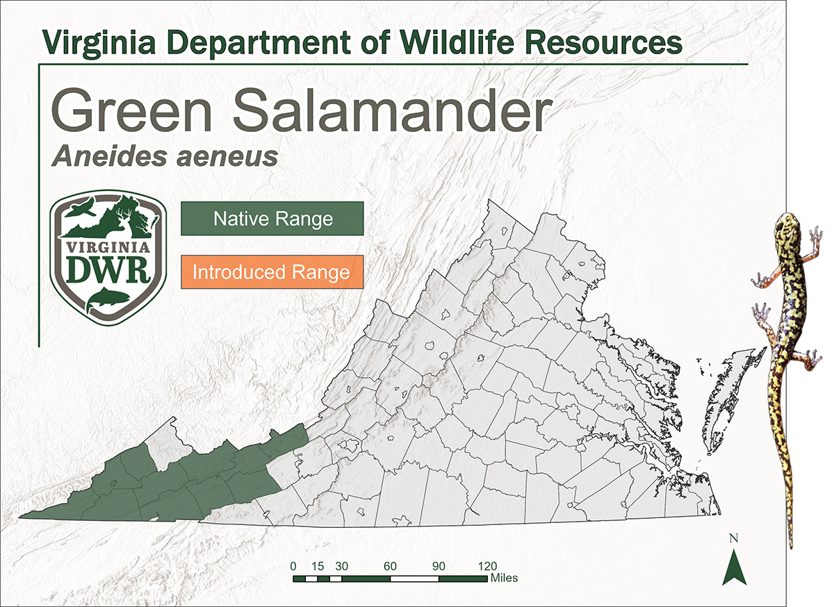 La salamandra verde en Virginia está restringida a las ecorregiones de Cumberland Mountain y Northern Ridge and Valley del suroeste de Virginia.