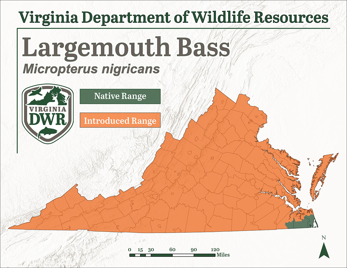 La lubina de boca grande es uno de los peces deportivos más populares en los Estados Unidos y se encuentra en todo Virginia. Son nativos de una pequeña porción de la cuenca de Albermarle en el sureste de Virginia.