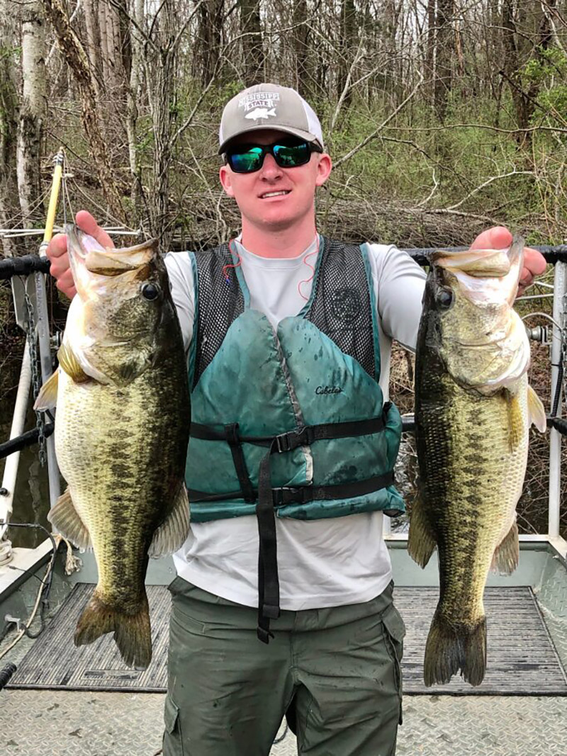 El biólogo pesquero de la Región II, Hunter Hatcher, muestra dos lobinas recolectadas durante una encuesta de la comunidad de peces.