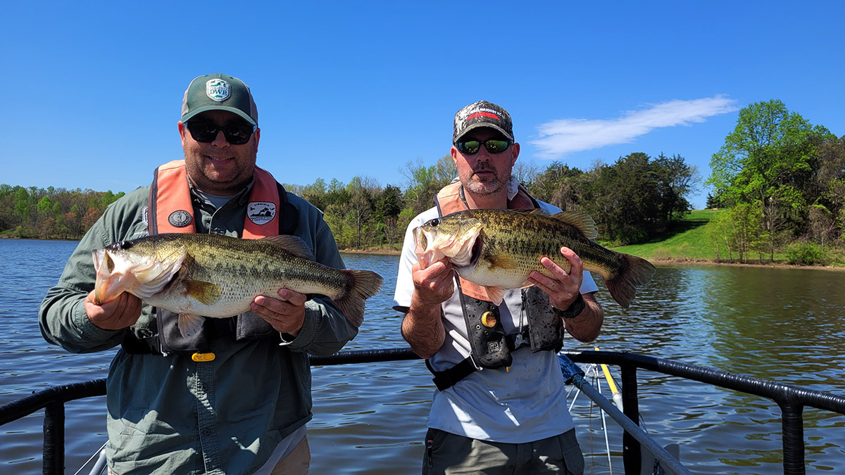 Los biólogos pesqueros de la Región IV, Mike Isel y Robbie Willis, muestran una pareja de lubinas recolectadas durante un evento de muestreo.