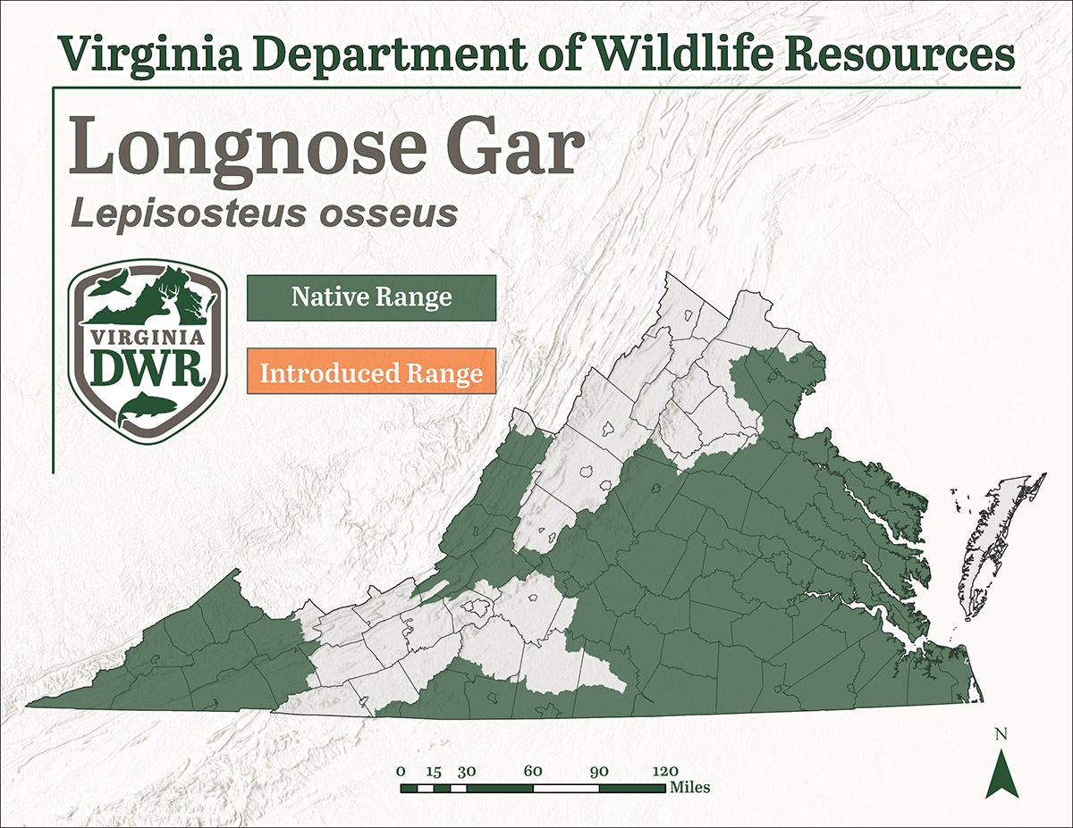 El Gar de nariz larga es nativo de Virginia y se puede encontrar en las cuencas hidrográficas de James, Potomac, Rappahannock, Roanoke, Upper Cumberland, Upper Tennessee y York.