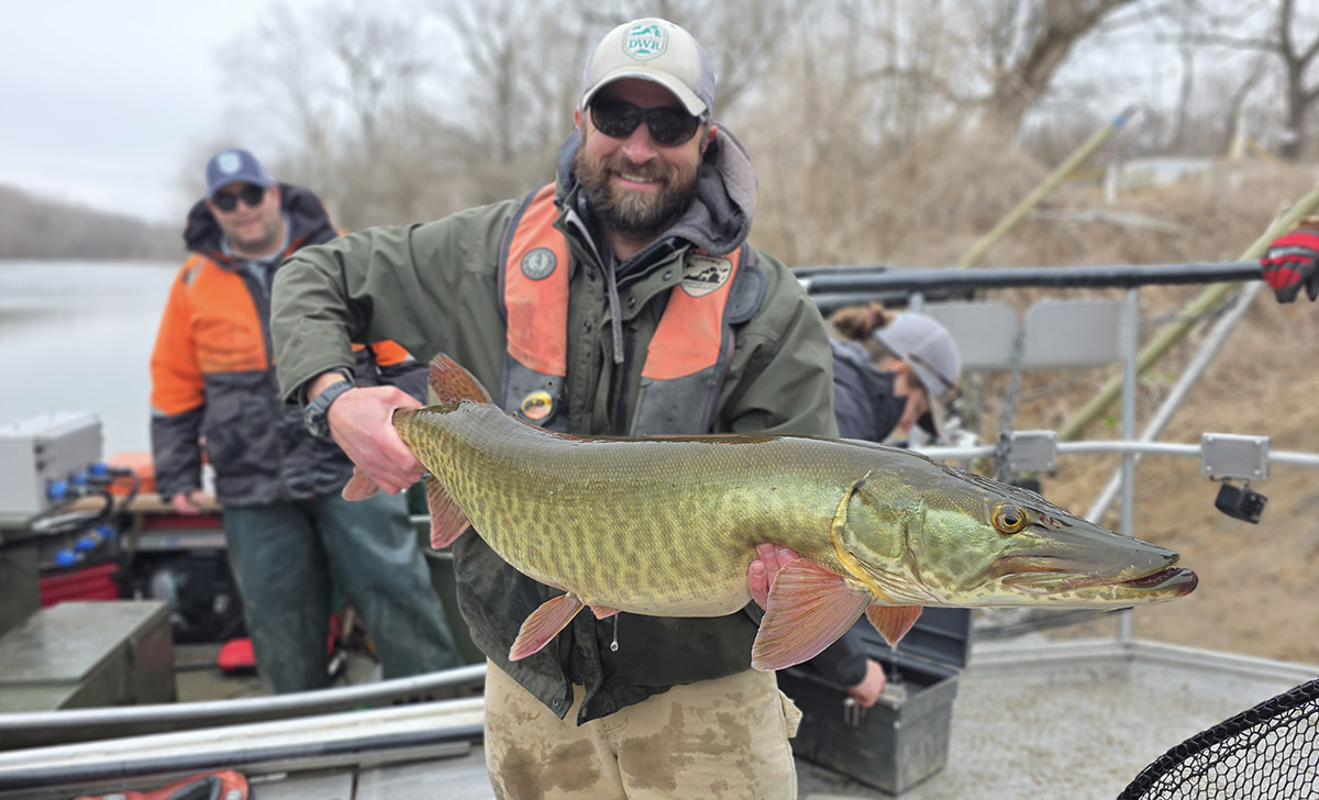 El biólogo pesquero Jason Hallacher exhibe un hermoso almizcle que fue recogido durante un estudio de población fluvial.