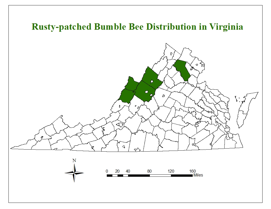 Actualmente, los abejorros parcheados oxidados solo se conocen en cinco condados de Virginia: Fauquier, Augusta, Bath, Highland y Rockingham. Los últimos cuatro condados, más occidentales, tienen una abundancia ligeramente mayor, lo que los convierte en las mejores opciones para encontrar la abeja. Sin embargo, incluso dentro de esos condados, sus poblaciones son extremadamente bajas, por lo que es muy raro verlos.