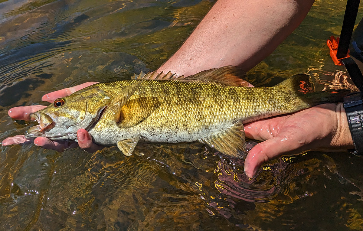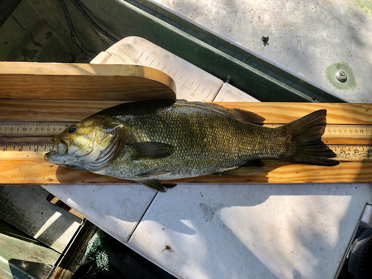 El biólogo pesquero Tyler Young muestra una lubina de boca pequeña capturada durante una encuesta comunitaria de peces en otoño.
