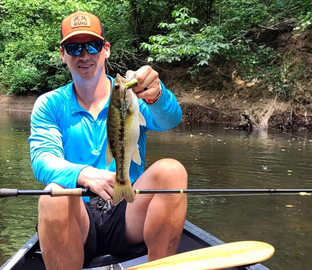 A pesar de tener un gran cangrejo de río en la garganta, esta lubina manchada tomó agresivamente un señuelo de rana de superficie, lo que subraya su naturaleza agresiva.