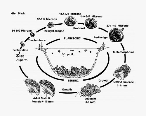 Los mejillones cebra son bivalvos de agua dulce (parientes de las almejas) y reciben su nombre apropiado por las bandas alternas onduladas oscuras (negras/marrones/verdes) y claras (amarillo, crema, blanco) en sus conchas, que varían o pueden estar ausentes. Los adultos tienen forma de D y generalmente tienen el tamaño de una uña del pulgar, pero pueden alcanzar un tamaño máximo de aproximadamente dos pulgadas. Si bien estos bivalvos tienen una vida relativamente corta (generalmente de 2a3 años), son reproductores extremadamente prolíficos, lo que contribuye a su capacidad para propagarse rápida y abundantemente. Una hembra adulta de mejillón cebra puede producir alrededor de 30,000a40000 huevos en cada ciclo reproductivo y más de 1 millones cada año. Las larvas microscópicas que nadan libremente, llamadas veligers, flotan en el agua durante varias semanas y luego se asientan en cualquier superficie dura que puedan encontrar. Los mejillones cebra también pueden tolerar una amplia gama de condiciones ambientales y los adultos pueden incluso sobrevivir fuera del agua durante unos 7 días. A diferencia de otros bivalvos de agua dulce, los mejillones cebra son capaces de adherirse a las superficies utilizando sus hilos bisales (ver foto) y formar grandes racimos similares a los criaderos de ostras. No es raro encontrar poblaciones con densidades de más de 100000 individuos por metro cuadrado, y algunas alcanzan hasta 1 millones por metro cuadrado. (Ver el ciclo de vida de un mejillón cebra).